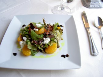 前菜は(山羊のミルクから出来ている)ゴートチーズとみかんのサラダ。マスタードドレッシングがかかっていた。