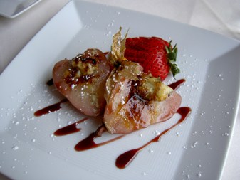 The dessert was pear comport, stuffed with stilton cheese. Stilton cheese is blue cheese from England. It matched with the taste of the pear comport. It was genius who came up with this one!