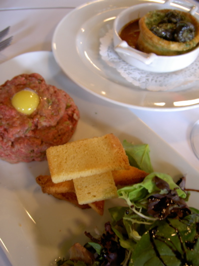 We shared Steak Tartar (raw beef mixed with mustard sauce and pickles) and escargots as starters.